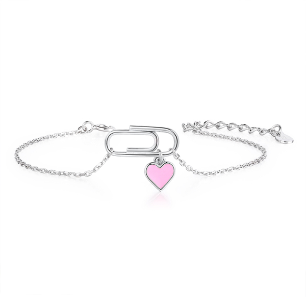 Цей елегантний срібний браслет з кулоном-скріпкою стане чудовим аксесуаром для будь-якої маленької модниці. На браслеті висить милий міні-кулончик у формі рожевого серця, який додає нотки ніжності та оригінальності. Регулюючий розмір (14 см + 3 см) дозволяє легко підібрати браслет під різні зап’ястя. Завдяки стильному дизайну, він сподобається як дівчаткам, так і їхнім батькам. Кожен браслет постачається в безкоштовному подарунковому упакуванні — ідеальний вибір для подарунка!
