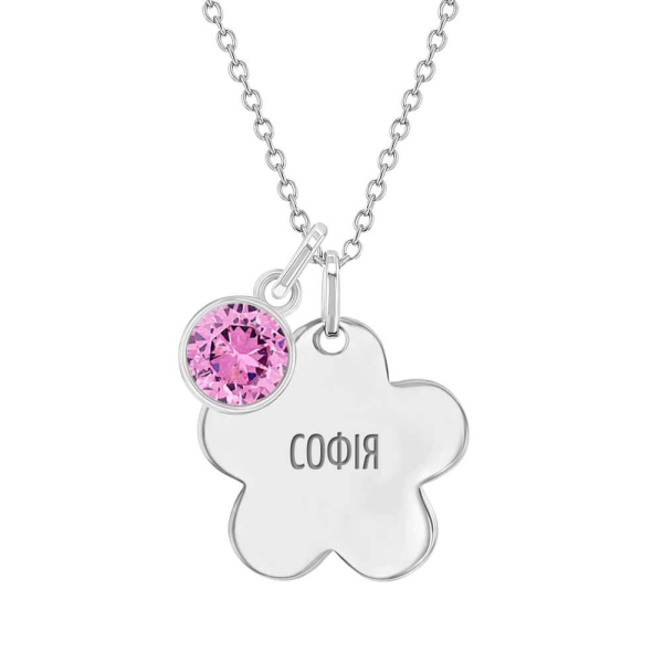 Це унікальне кольє з підвіскою у вигляді квітки та неймовірно-сяючим фіанітом стане гарним та значним подарунком до святкування дня народження молодої дівчини. Родований кулон, на якому ми можемо вигравіювати будь-яке ім'я або ініціали дівчинки (Безкоштовна послуга). Цей кулон поставляється з відповідним гіпоалергенним ланцюжком 38см або 40см.