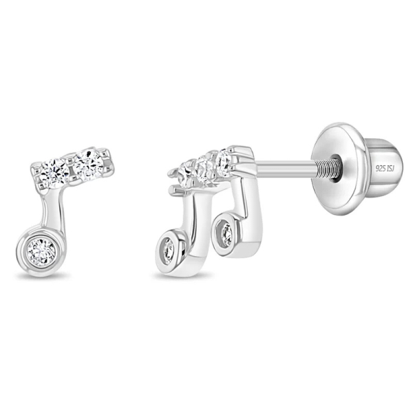 Сяюча пара сережок з музичними нотами, що закручуються, які сподобаються будь-якій маленькій дівчинці, що любить музику. Крихітні сережки, які будуть надійно і зручно сидіти на її вухах. Красиво прикрашені прозорими фіанітами, ці сережки - пара, яку вона не забуде. Подарункова коробка додається до покупки.